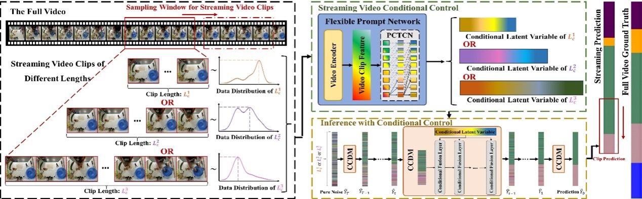 该项成果提出了一种基于扩散模型的动态流式时间行为分割模型(FSTAS-DM)。通过利用具有不同特征分布的视频片段作为控制条件,我们的模型能够适应训练和测试领域之间分布的变化和不一致。此外,我们还引入了一种多阶段条件控制训练策略(MSCC),该策略增强了模型的时间泛化能力。