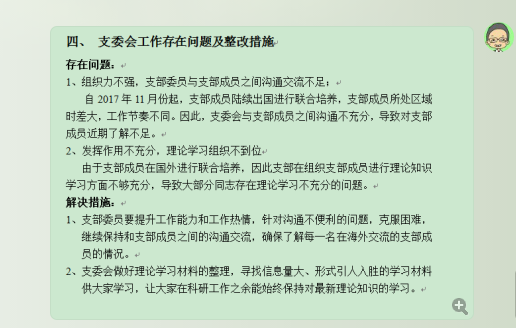 由于目前博13支部大多数成员(超过85%)在国外进行联合培养,并且各成员联合培养所在国度时区差异较大,本次会议采用网络会议的形式。会议开始,刘洋同志首先向支部成员汇报了支部近一年的工作情况,并代表支委会对支委会工作中存在的问题向支部成员进行了自我批评。支委会自察存在的问题主要包括:第一、组织力不强,支部委员与支部成员之间沟通交流不足;第二、发挥作用不充分,理论学习组织不到位。针对这些问题,支委会根据支部成员的建议列出了整改措施,包括:1、支部委员要提升工作能力和工作热情,针对沟通不便利的问题,克服困难,继续保持和支部成员之间的沟通交流,确保了解每一名在海外交流的支部成员的情况。2、支委会做好理论学习材料的整理,寻找信息量大、形式引人入胜的学习材料供大家学习,让大家在科研工作之余能始终保持对最新理论知识的学习。