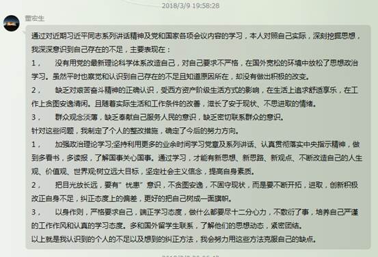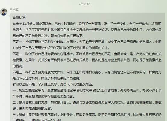 会议的最后,孙老师对博13支部成员克服地域时差、科研压力、生活不便等困难,对照学校民主评议党员工作的要求积极自省,完成批评与自我批评给予肯定,并鼓励支部成员积极改正身上的不足,争取不断自我革新,不断进步。