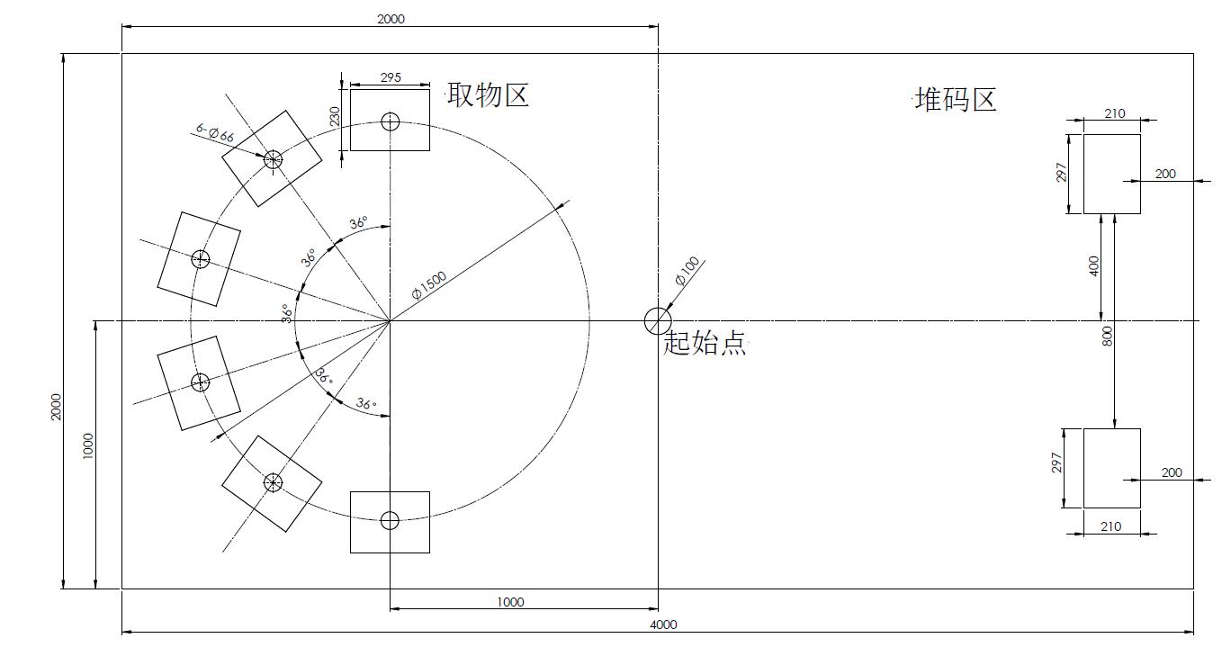 比赛整体场地布置如图3所示的矩形区域,整体面积为2000mm×4000mm,分取物区和堆码区两块区域。
